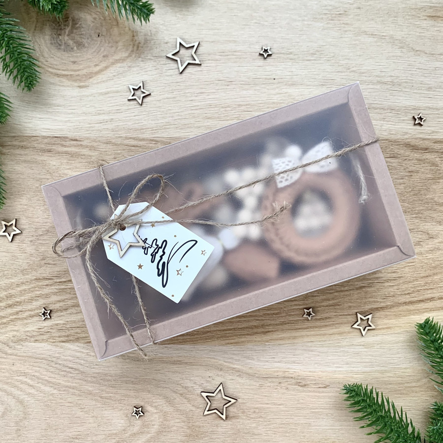 L'ensemble comprend 5 décorations, un emballage cadeau et une carte postale. Couleurs : jaune terre, beige, or.