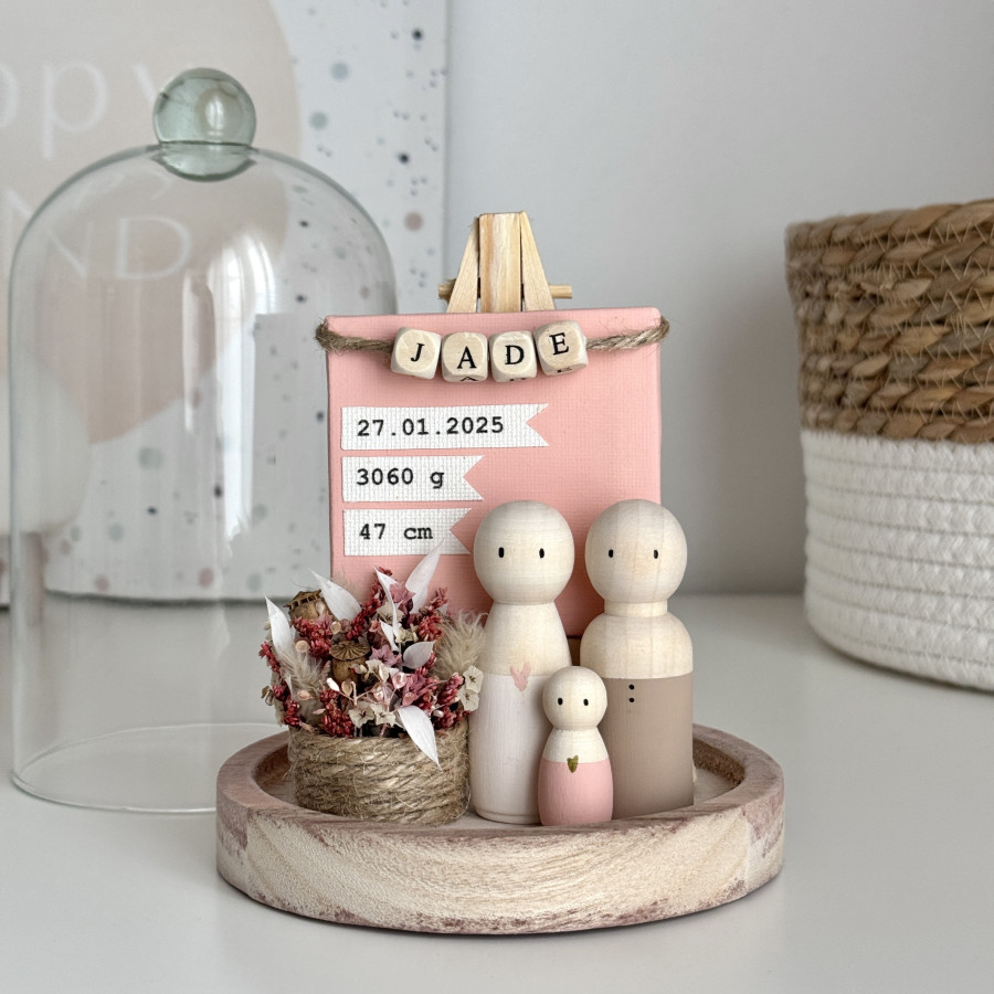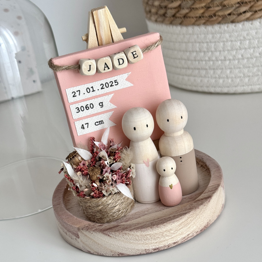 C'est le cadeau parfait pour de jeunes parents et une décoration charmante pour la chambre de bébé, conservant le souvenir du jour le plus important de la famille