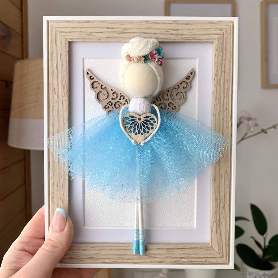 Poupée-ballerine en macramé avec des fleurs séchées dans un cadre
